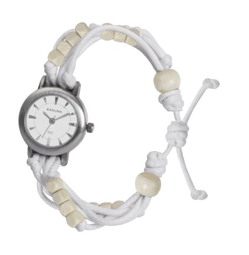 Fun and Friendship from Kahuna! Ladies Kahuna friendship watch with a white multi thong strap featuring white wooden beads. The watch features an antique silver coloured case and a Kahuna engraved fastening toggle. The white satin dial has silver detailing with a polished finish.